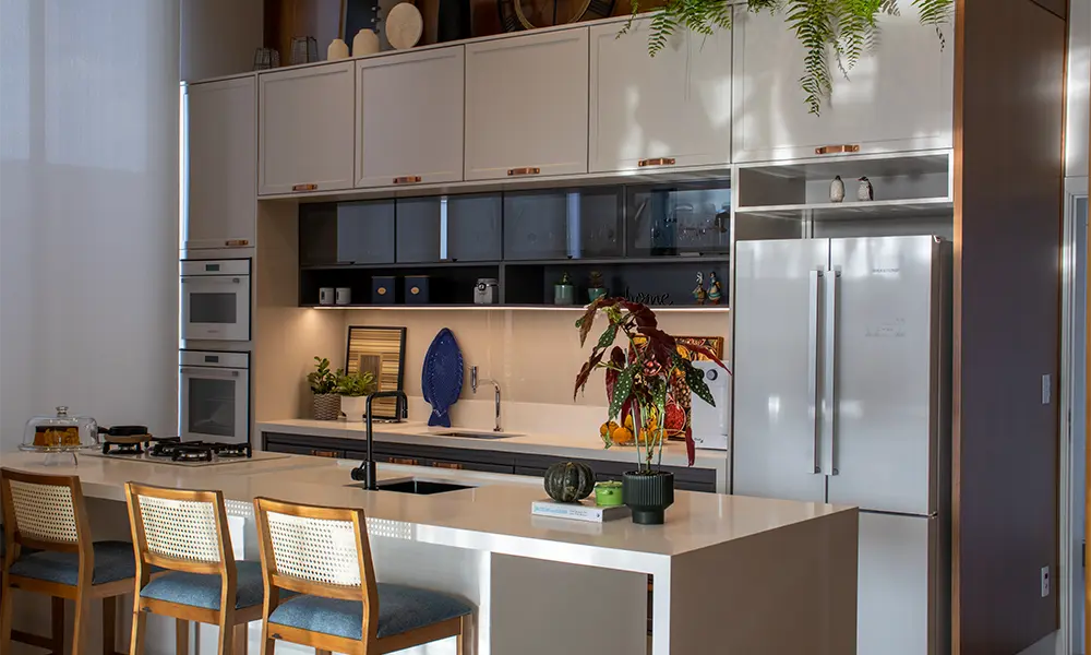 Bancadas nobres, marcenaria e adega elevam o gourmet exclusivo fazendo de cada receita um espetáculo de convívio.